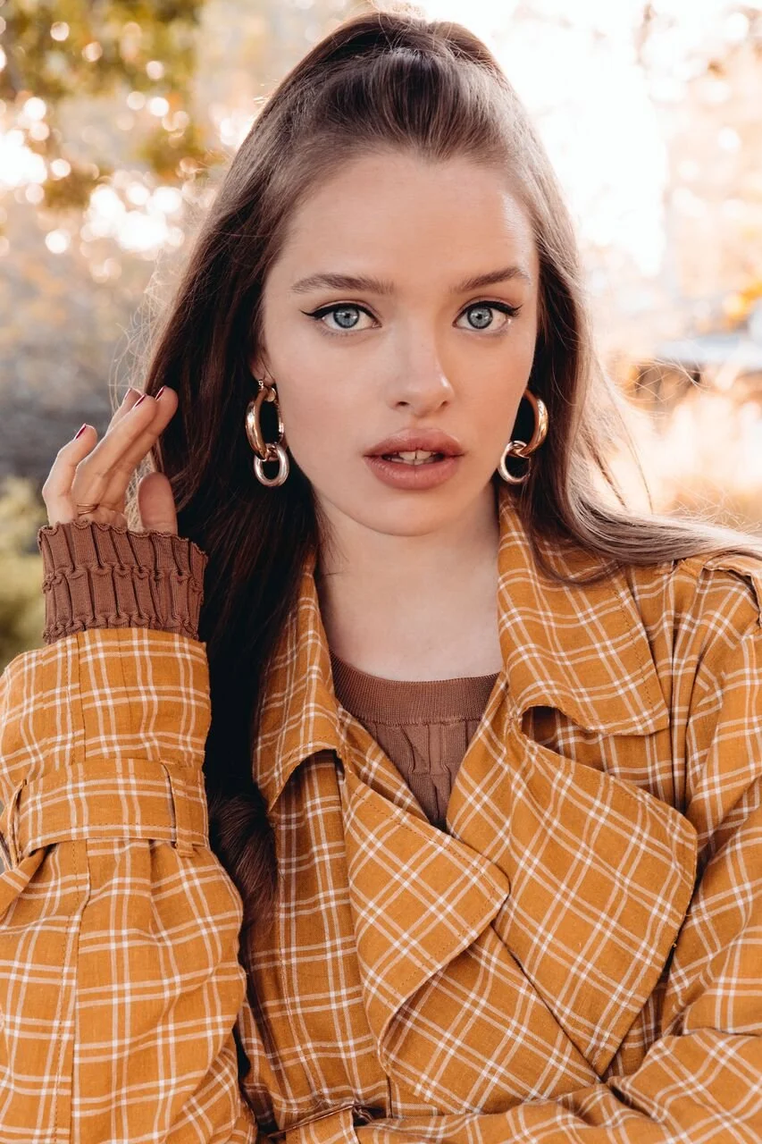 A young woman with long brown hair, blue eyes, and large silver hoop earrings looks directly at the camera in an outdoor setting with trees and sunlight in the background. She is wearing a brown ribbed top and an orange plaid jacket, with one hand touching her hair.